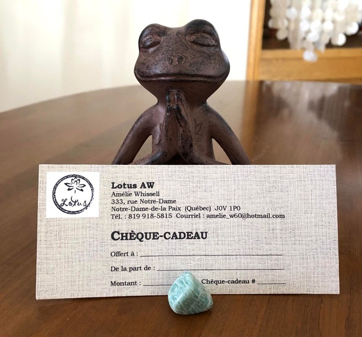 Mon entreprise Lotus AW est à même mon domicile dans le but de favoriser le mieux-être et ce, avec des approches spirituelles, holistiques et de mieux-être en plus de la naturothérapie.